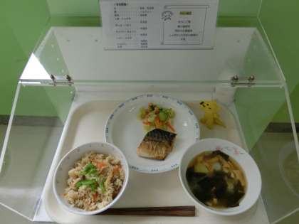きのこご飯・さばの塩焼き・野菜の生姜醤油・じゃが芋とわかめの味噌汁・牛乳