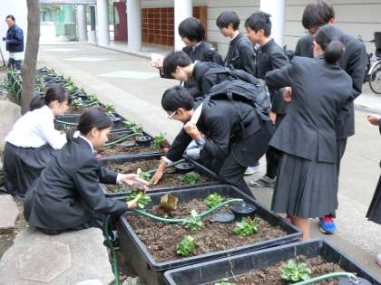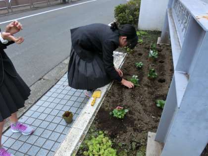 放課後に生徒会役員と学校主事が正門等に植え付け作業を行いました。