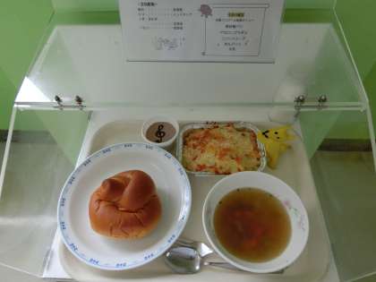 黒砂糖パン・マカロニグラタン・コンソメスープ・おんプリン・牛乳