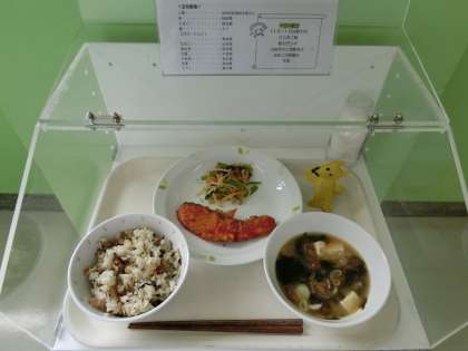 ひじきご飯・鮭のザンギ・小松菜のごま酢和え・なめこの味噌汁・牛乳