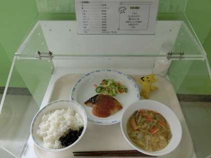 ご飯・ひじきのふりかけ・鯖のおろしソースかけ・野菜の生姜醤油・白菜のみそ汁・牛乳