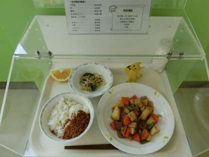 麦ごはん・かつおのでんぶ・肉じゃがのうま煮・小松菜のごまあえ・はるか・牛乳