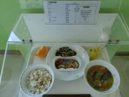 大豆とじゃこのご飯・鰆の炒め野菜焼き・小松菜のごま酢かけ・白菜の味噌汁・デコポン・牛乳