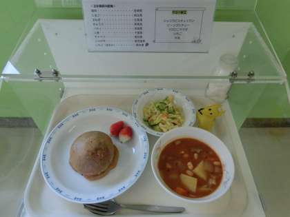 ショコラビスキュイパン・ビーンズシチュー・マカロニサラダ・いちご・牛乳