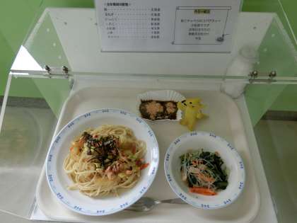 鮭と春キャベツのスパケティー・小松菜のサラダ・抹茶白玉の黒蜜きな粉かけ・牛乳