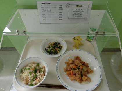 子ぎつねご飯・凍り豆腐とじゃが芋のそぼろあんかけ・野菜のからしじょうゆ・ジョアマスカット
