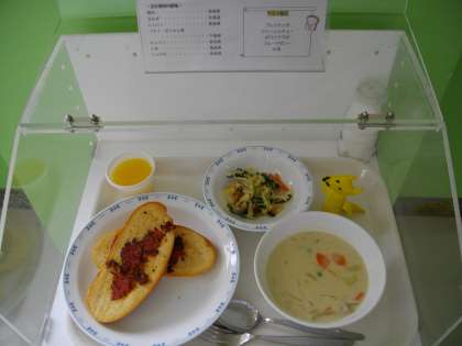 ブルスケッタ・クリームシチュー・ポパイサラダ・フルーツゼリー・牛乳