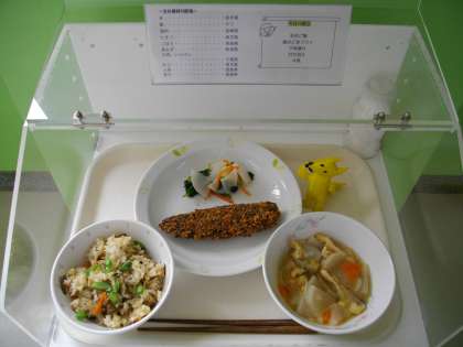 五目ごはん・鮭のごまフライ・千枚漬け・打ち豆汁・牛乳