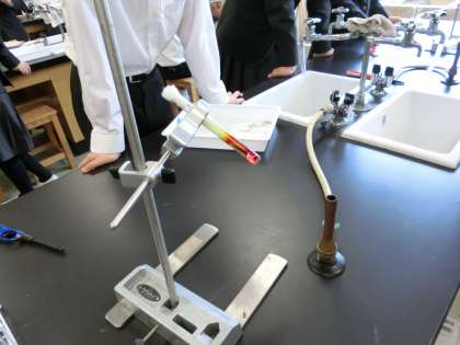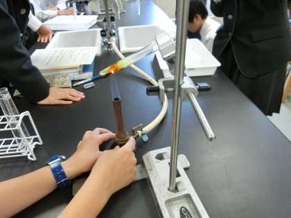 鉄と硫黄の化合の実験を行いました。先生の指示をよく聞いて、安全に注意しながら実験しました。