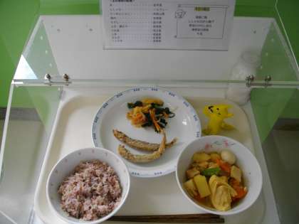 雑穀ご飯・ししゃものから揚げ・野菜のからし和え・春野菜の煮物・牛乳