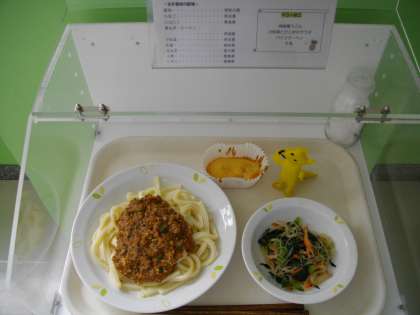 肉味噌うどん・小松菜とひじきのサラダ・パインクーヘン・牛乳