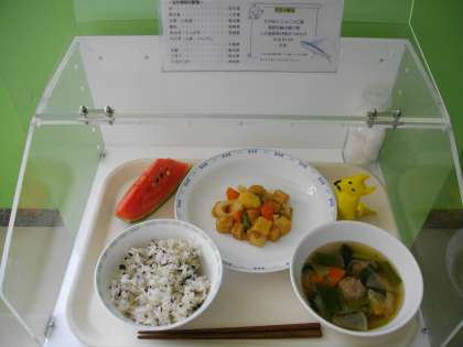 わかめとじゃこのご飯・高野豆腐の揚げ煮・八丈島産飛び魚のつみれ汁・小玉すいか・牛乳