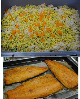 半身でとった鮭をオーブンで焼いて、ほぐして、もう一度さっとオーブンにかけてすし飯に混ぜました。