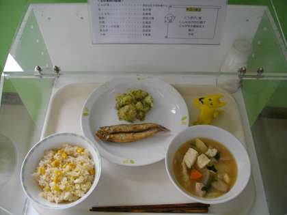 とうきびご飯・ししゃものから揚げ・じゃが芋の香味和え・豚汁・牛乳