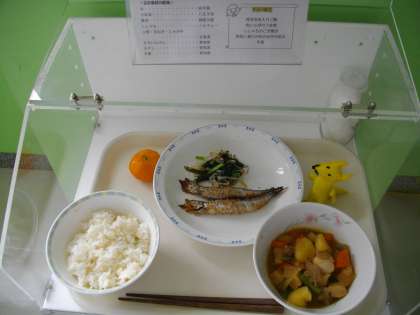 発芽玄米入りご飯・肉じゃがのうま煮・ししゃものごま焼き・野菜と茎わかめのゆかり和え・冷凍みかん・牛乳