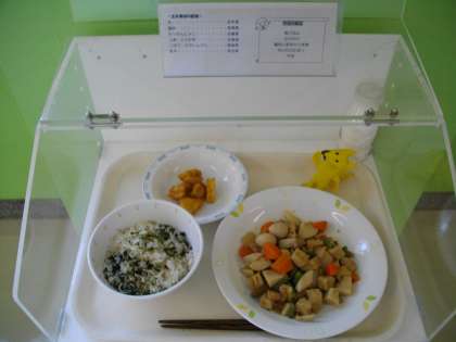 麦ご飯・ふりかけ・鶏肉と里芋のうま煮・せいだのたまじ・牛乳