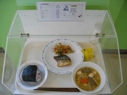 新米おむすび・鯖の塩焼き・野菜のごまあえ・豚汁・牛乳