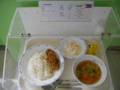 酢や香辛料、にんにくなどで鶏肉を甘酸っぱく煮た料理です。ご飯と一緒に食べると美味しいよ!と教えてくださったクリスティーナ先生。今日は、スピーチコンテストで給食を食べてもらえず残念でした…。(チキンアドボは、地域や家庭ごとに味付けに入るものも少しずつ違うそうで、学校では玉ねぎとにんにくを入れましたが、クリスティーナ先生はニンニクたけ!と言っていました。)