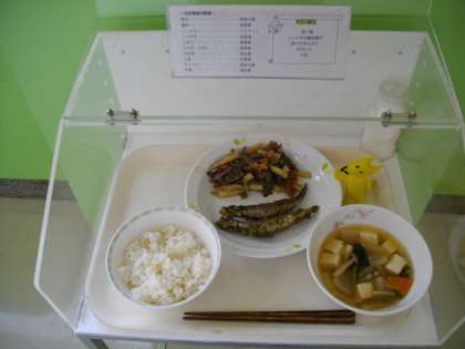 麦ご飯・ししゃもの磯部揚げ・変わりきんぴら・きのこ汁・牛乳