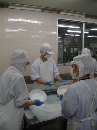 一人分を量って、魚の向きに気をつけ、彩よく綺麗に盛り付けをしていました。