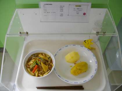 カレー南蛮うどん・スウィートポテト・りんご・牛乳