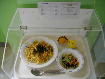 鮭とキャベツのスパゲティー・海藻サラダ・パンプキンスフレ・牛乳
