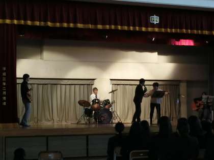 3年生のお別れ会が体育館で開かれました。3年職員によるバンド演奏もありました。