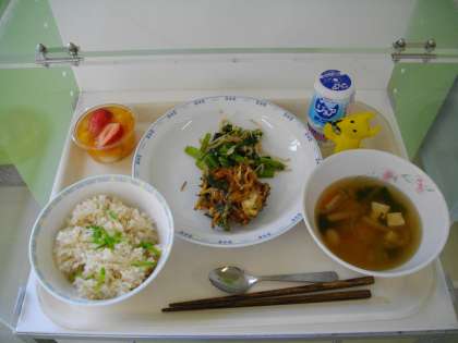 鯛飯・ねぎのかき揚げ・野菜のごまあえ・春の五目汁・白玉フルーツポンチ・牛乳
