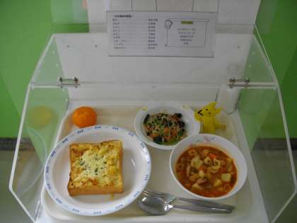 ツナポテトースト・ミネストローネ・小松菜サラダ・冷凍みかん・牛乳