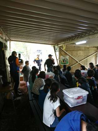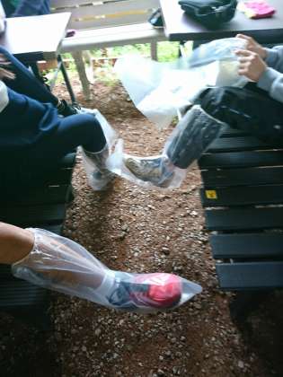 酪農体験が始まります。A組B組のは小林牧場、C組D組は松下牧場での体験です。防疫のため、ブーツカバーをはきます。