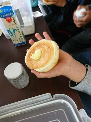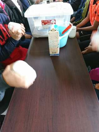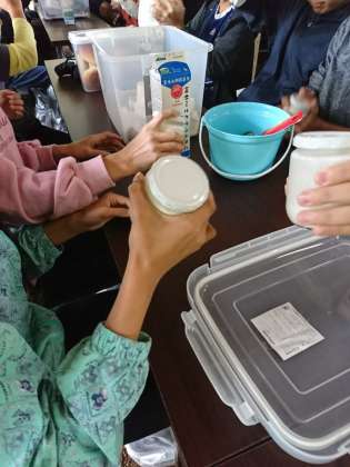 酪農体験のバター作りの様子です。瓶のなかに牛乳が入っています。音楽にあわせて瓶をふってできあがりです。