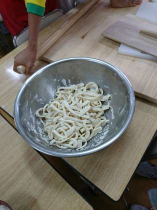 学園の食堂でのうどん作りに様子です。完成したうどんです。