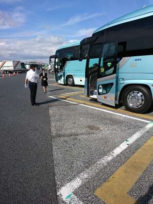 海老名サービスエリアに15時30分到着しました。15時45分出発予定です。先ほど14時30分到着予定は誤りです。学校到着予定時間は16時30分です。