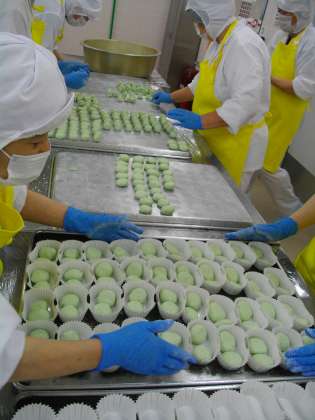 春先に出たよもぎの新芽を摘んでゆで、細かく刻んだり、ミキサーでペースト状にしたりして餅に混ぜて作ります。(今日は冷凍のペースト状のよもぎを混ぜました)