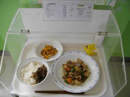 今日に合わせて、しっかり噛める食材と食物繊維の多い食材を組み合わせた献立にしました。食物繊維の多い食材は、よく噛むことがポイントです。よく噛んで繊維を細かくすることで、からだへの働きの効果が上がります。また、歯の表面をきれいにしてくれるとも言われます。