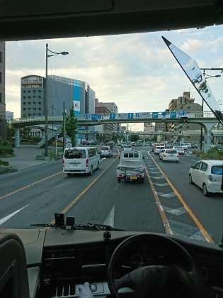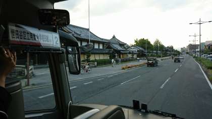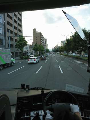 バスは京都市内五条通りを通過しています。堀川通りを走っています。