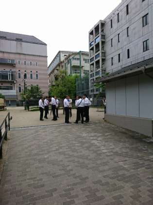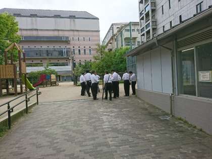 宿舎前の公園では、タクシーの運転手さんの朝の全体打ち合わせも終わり、互いに生徒の昼食についての情報交換をされています。
