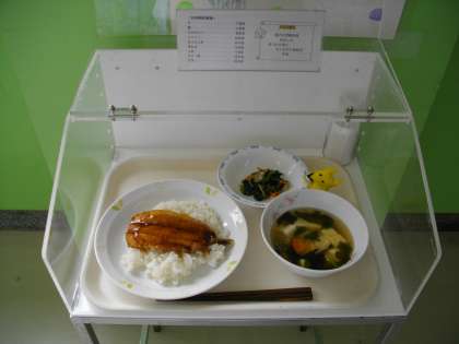 魚のかば焼き丼・ほうれん草と竹輪のごま和え・すまし汁・牛乳