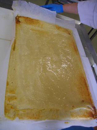 2枚目の写真は、バスブーサ。セモリナ粉で作るケーキです。シロップに漬けて作ります。大きな天板で焼き、冷めてからレモン汁、砂糖で作ったシロップをふりかけなじませて切り分けました。