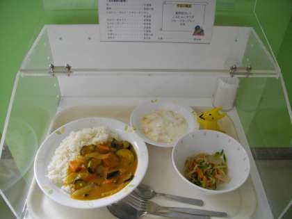 夏野菜カレー・こんにゃくサラダ・フルーツヨーグルト・牛乳