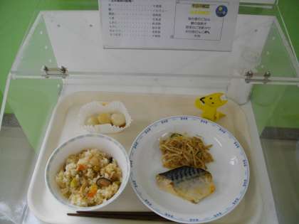 秋の香りごはん・鯖の塩焼き・野菜のごま酢かけ・お月見団子・牛乳