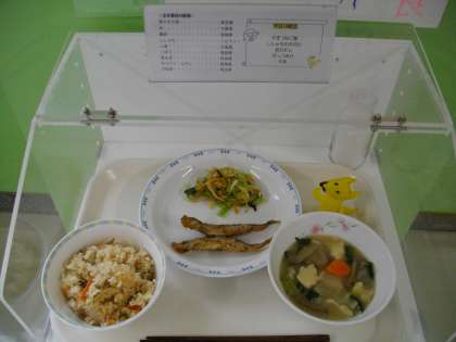 子ぎつねご飯・ししゃもの天ぷら・おひたし・ひっつみ汁・牛乳