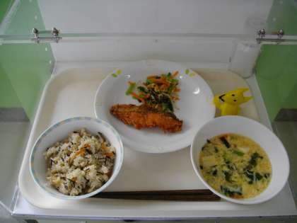 ひじきご飯・鮭のザンギ・野菜のごま酢かけ・かき玉汁・牛乳