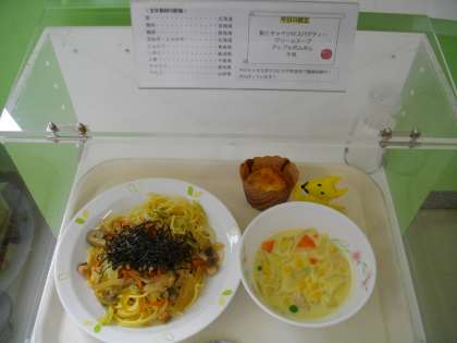 鮭とキャベツのスパゲティー・クリームスープ・アップルポムポム・牛乳