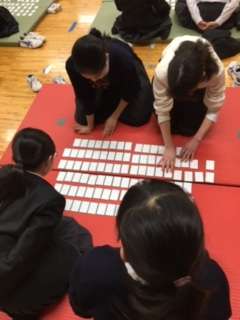 各クラス1名のクラス対抗で百人一首大会が始まりました。ラッキーカードがあり、その札を取った人は3枚分になります。