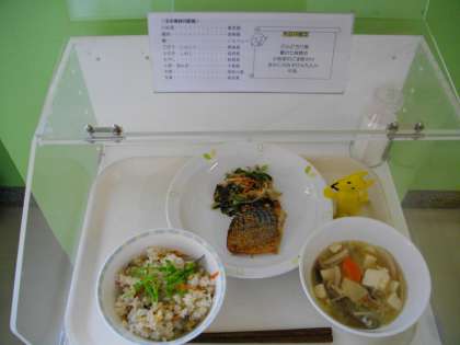 どんどろけ飯・鯖の七味焼き・小松菜のごま酢かけ・きのこのみそけんちん汁・牛乳