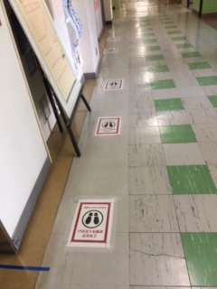 トイレも混雑しないように待ってもらう線をつけました。校舎に入る際に手洗い等、生徒も協力しています。