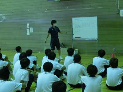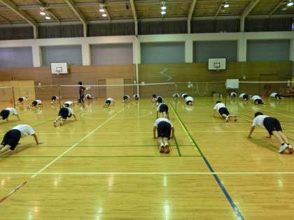 本日2校時に男子体育の研究授業を教育実習生が行いました。バドミントンのフォアとバックの打ち方を学習しました。写真は準備のランニングと運動、説明シーンです。