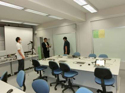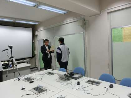現在コロナ対策で体育館に全校が集合できません。そのため、今回の全校朝会もウエッブを利用して画像配信しました。写真は動画を見ているクラスの様子と表彰された陸上部の2年生2名です。