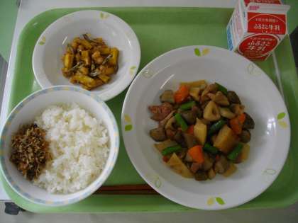 今日は少し早いですが、いい歯の日にちなんでかみかみメニューを出しました。じゃこや昆布の入った佃煮や、根菜がたくさん入った煮物など、噛みごたえがあるメニューで、生徒達も良く食べていました。